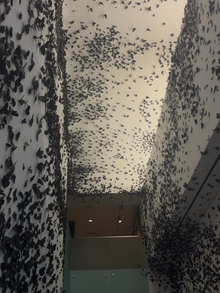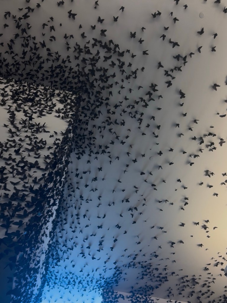 He was inspired by the annual migration of monarch butterflies from Canada to Mexico. All over the walls and ceilings are thousands of different-sized black monarch butterflies, 25,000 to be exact. They represent the “swarm” that one would see during migration. It is seriously such a surreal, cool thing to see. I’m in awe every time I go, it never gets old no matter how many times you see it.